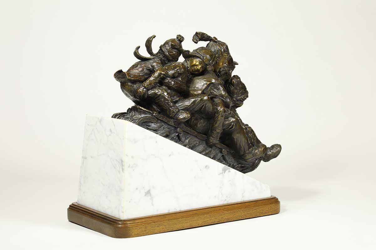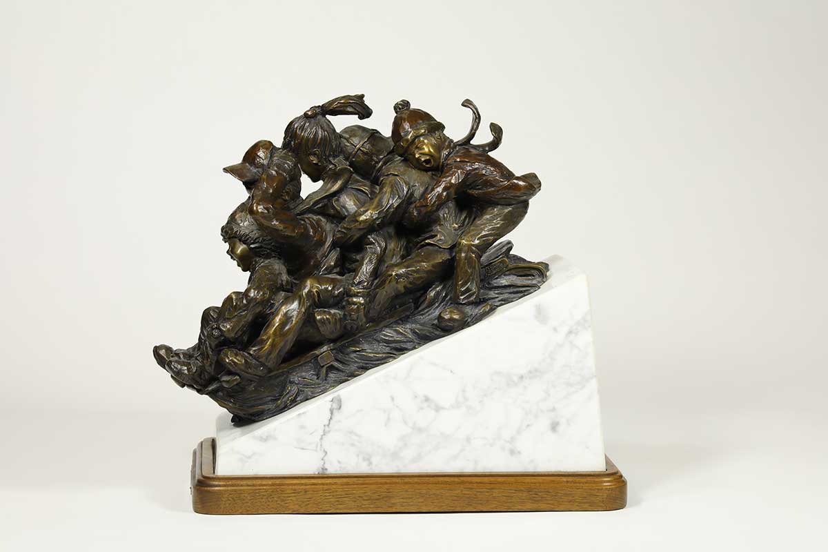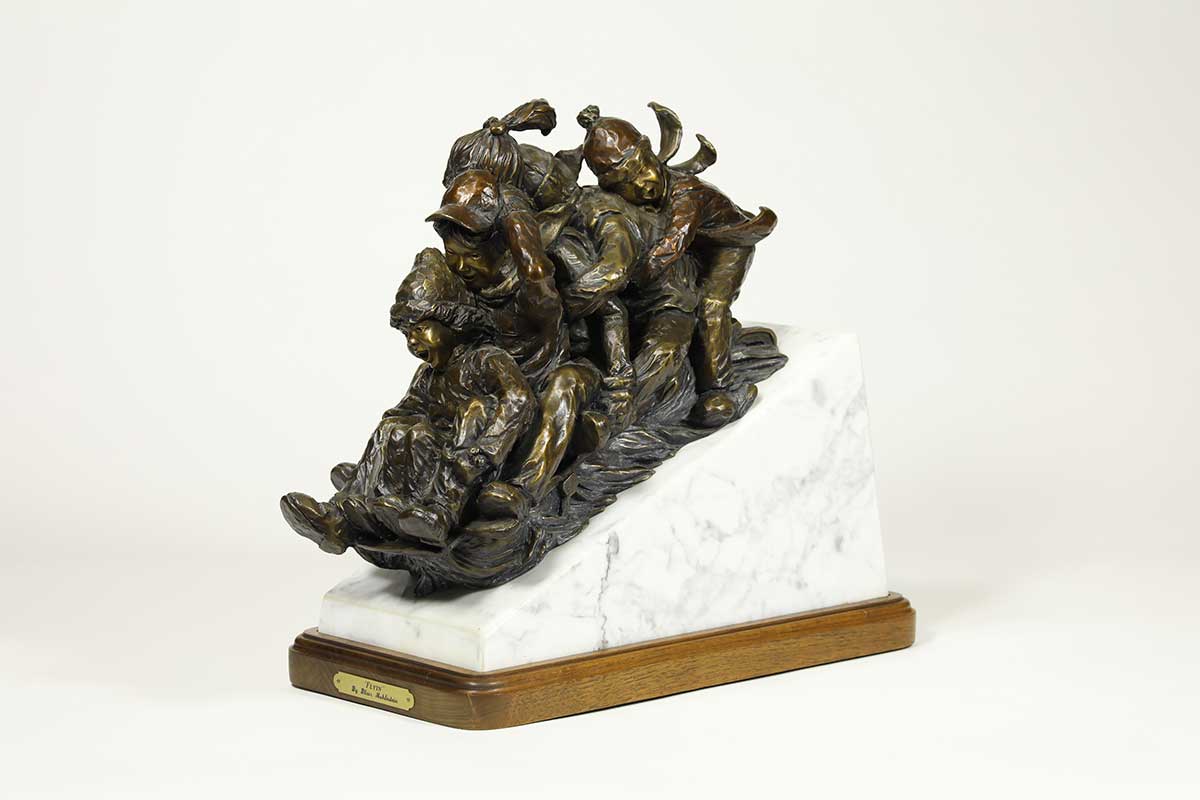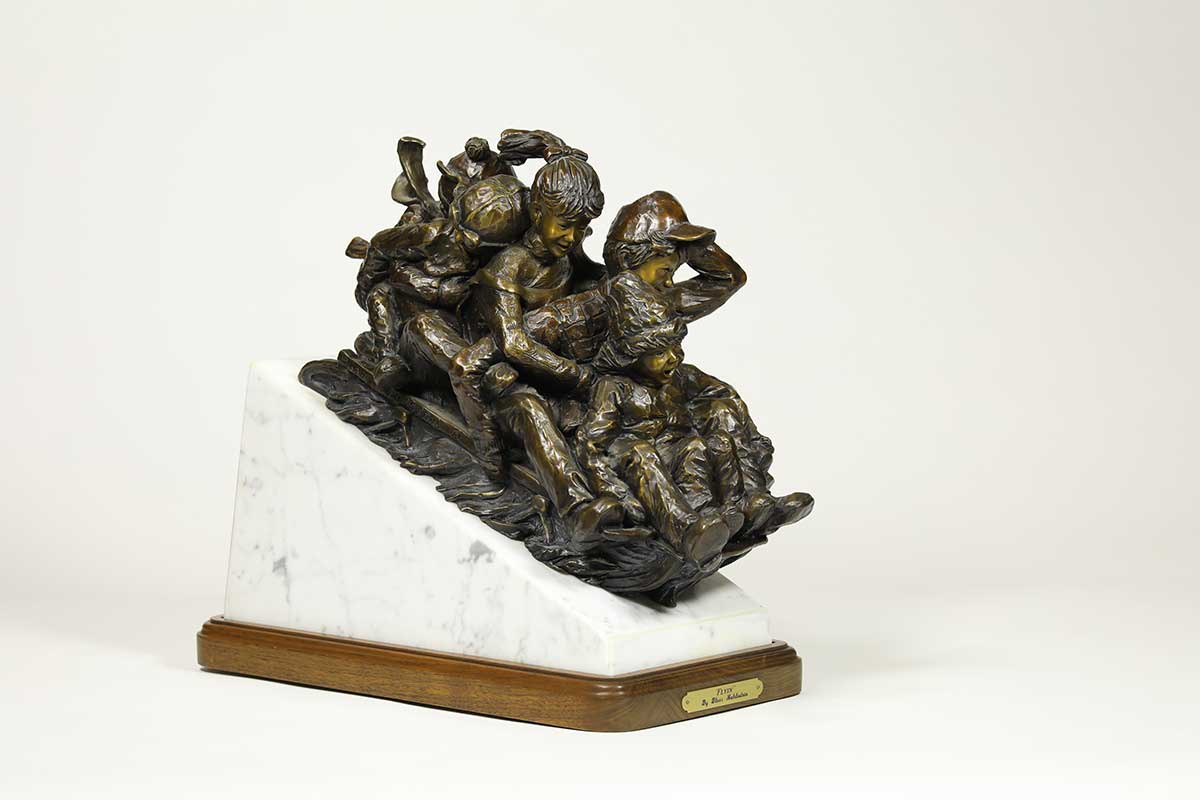 “Flyin’” for the Kid in us, a bronze sledding sculpture by noted Sculptor-Artist Blair Muhlestein. A very nice limited edition action fun sculpture “Flyin’“. Available now on SculptureCollector.com, the premier platform for purchasing or reselling creative sculptures securely and privately. Great condition, purchased in 1994, Braver Creek Colo.