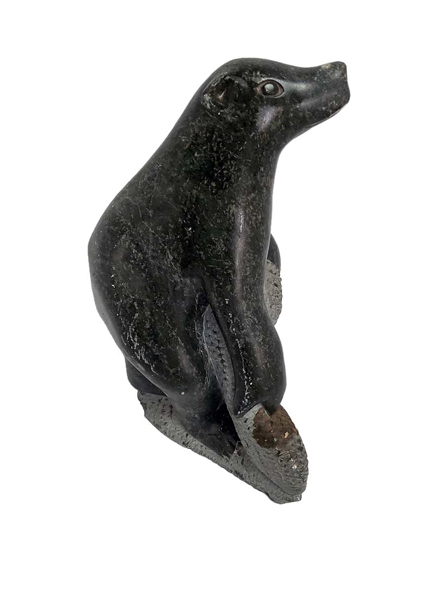 Soapstone Seal a hand carved soap stone seal by Canadian Eskimo Art. “Esquimau”, sculpted in 1981. Rotating base provided. Difficulty deciphering numbers and signature. A nice example of Inuit Art available from SculptureCollector.com where unique, creative, and collectible Sculpure is bought and sold in a secure and private manner globally.