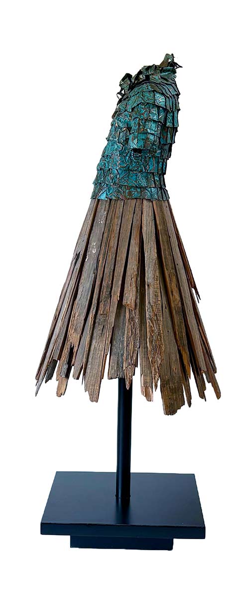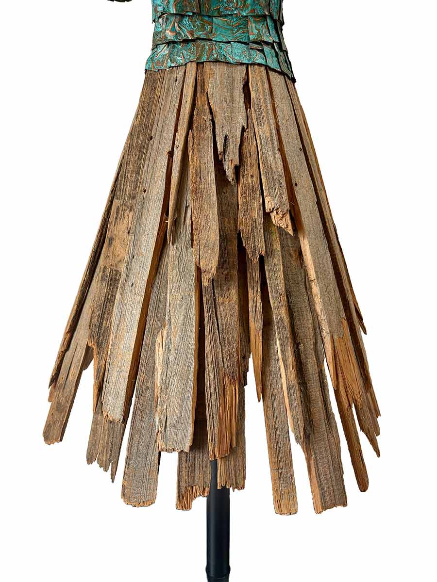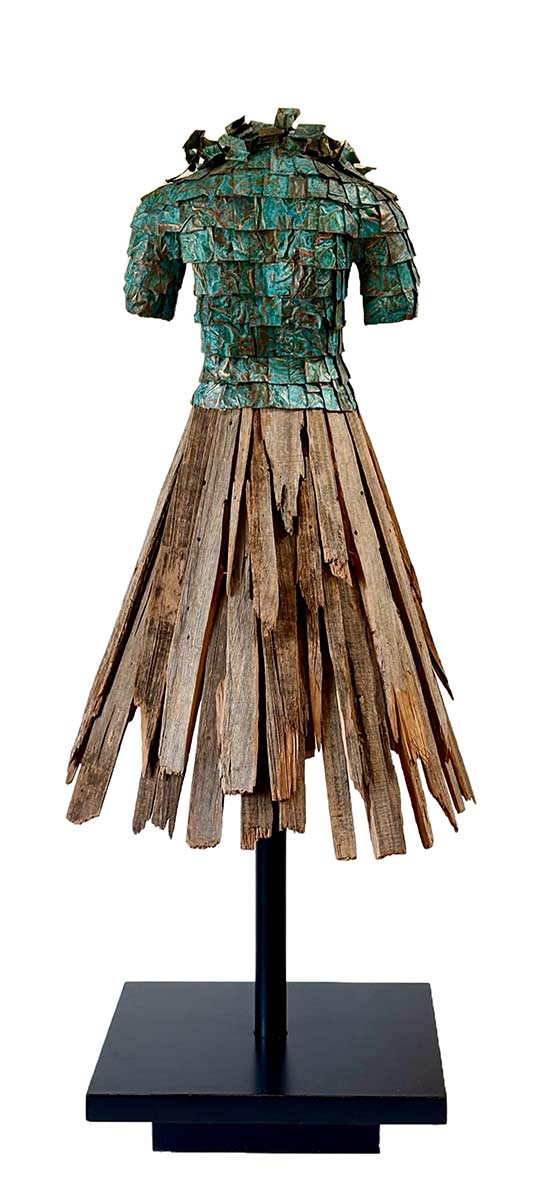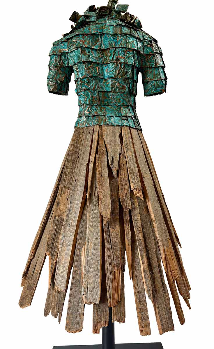 One of a series of dress sculptures by sculptor, John Petrey. Mixed media of painted copper and barn wood that artist found in Winter Park, FL. This piece blends nature and creativity that stirs the emotions of the viewer. It’s inspiring to people who are attracted to fashion, design and anyone who has or does make their own clothes. The mixed-media sculpture was purchased from the sculptor at the Winter Park (FL) Arts Festival, and it is admired by all – female and male! This unique sculpture is now available for purchase through SculptureCollector.com where creative sculpture and sculptural objects are purchased in a secure and private manner globally. John Petrey is a nationally renowned sculptor represented in galleries and public installations. His work can be viewed at johnpetrey.com