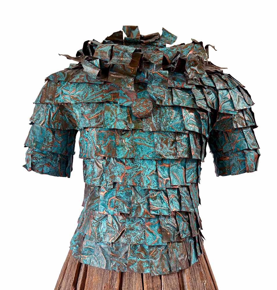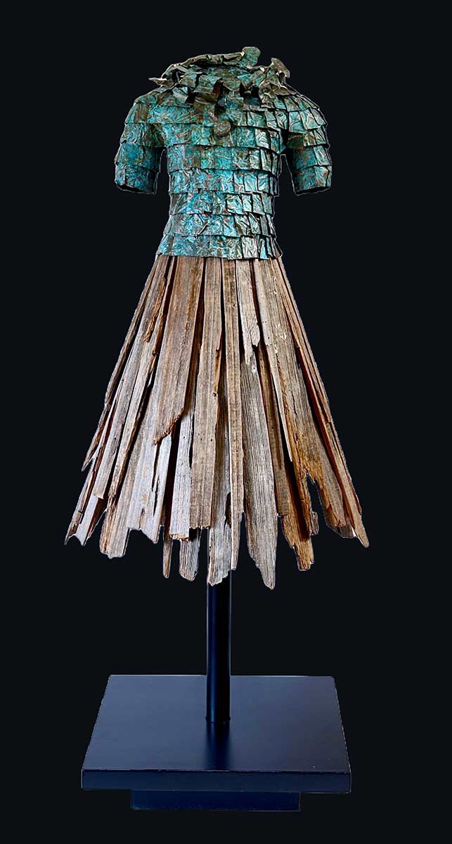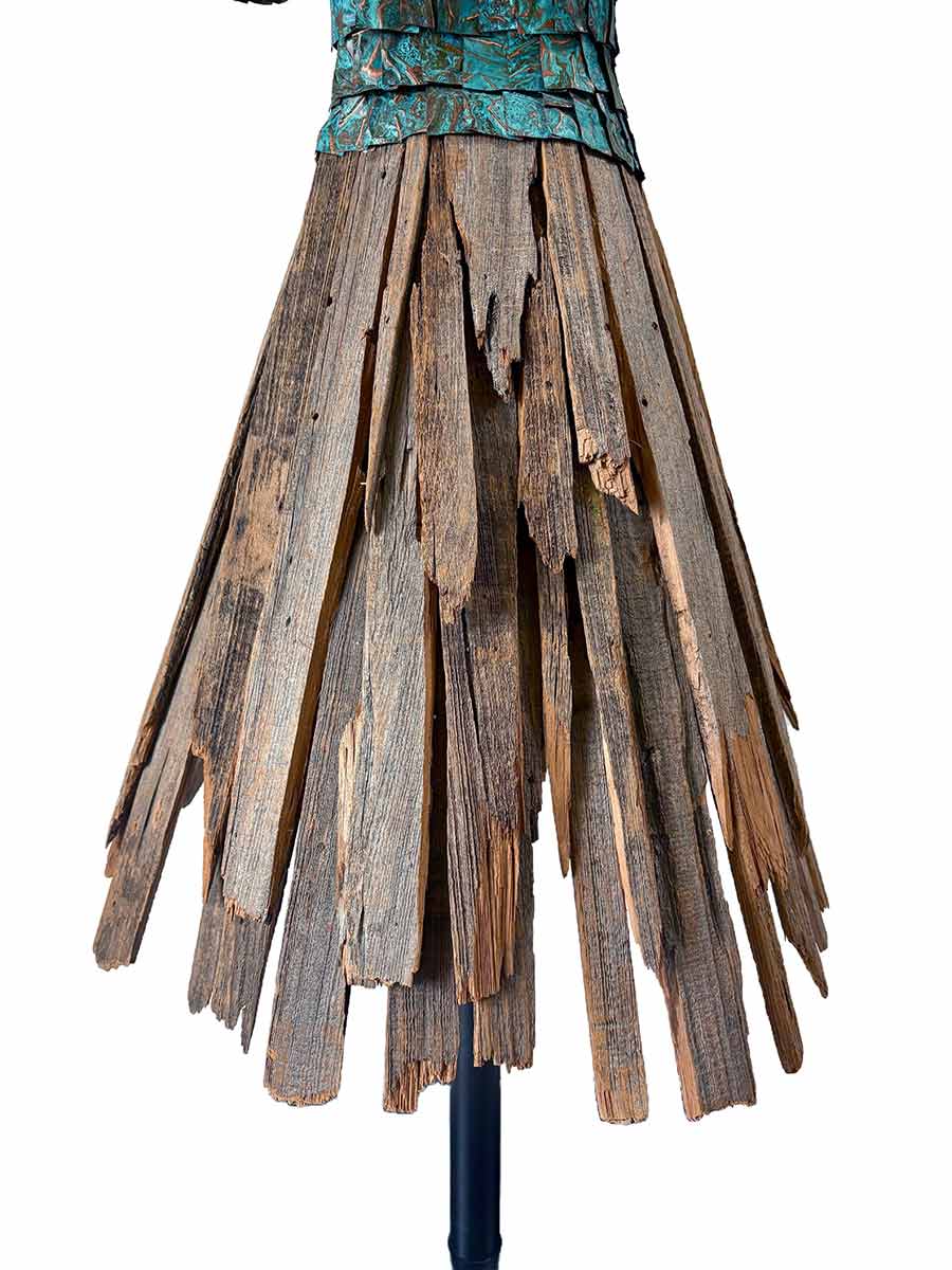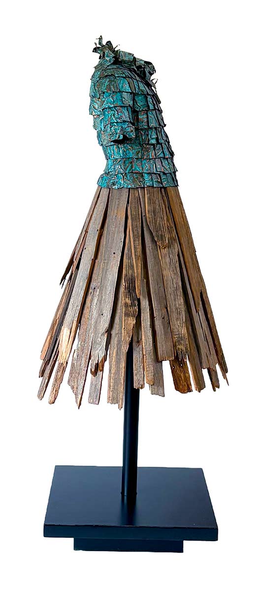 One of a series of dress sculptures by sculptor, John Petrey. Mixed media of painted copper and barn wood that artist found in Winter Park, FL. This piece blends nature and creativity that stirs the emotions of the viewer. It’s inspiring to people who are attracted to fashion, design and anyone who has or does make their own clothes. The mixed-media sculpture was purchased from the sculptor at the Winter Park (FL) Arts Festival, and it is admired by all – female and male! This unique sculpture is now available for purchase through SculptureCollector.com where creative sculpture and sculptural objects are purchased in a secure and private manner globally. John Petrey is a nationally renowned sculptor represented in galleries and public installations. His work can be viewed at johnpetrey.com