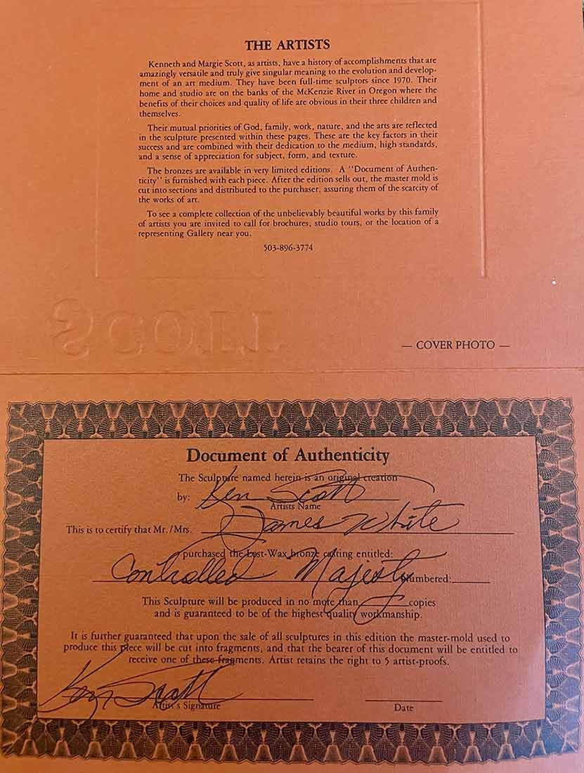 A rarely available bronze eagle sculpture that is recognized and collected worldwide. This sculpture titled “Controlled Majesty” is yet another meaningful equine sculpture by the noted and collected worldwide sculptor-artist “Ken Scott“. Available now on SculptureCollector.com, the premier platform for purchasing or reselling creative sculptures securely and privately.