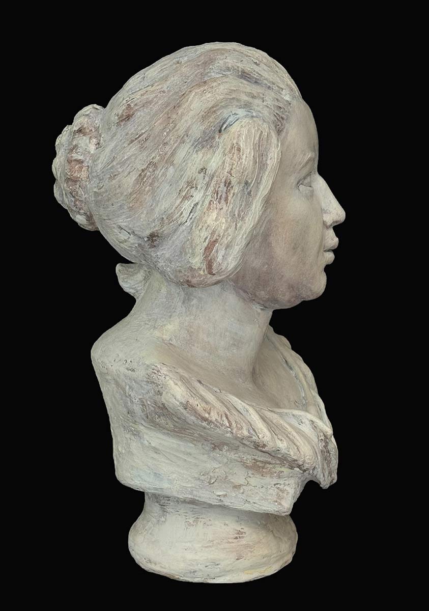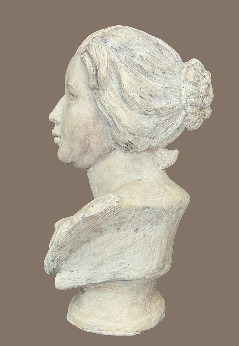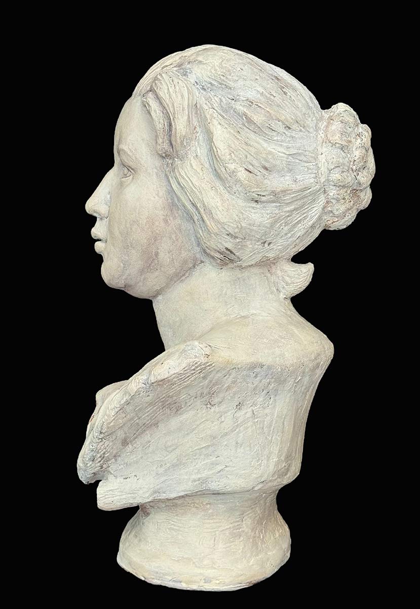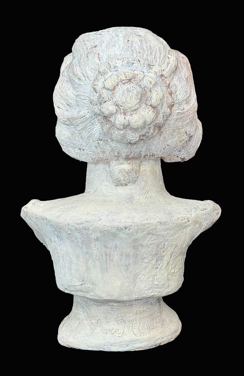 Bernini carved Costanza in the 16th century. She was his mistress and the wife of one of his assistant. Dana McCullough, this is her artist rendition of Costanza… capturing her wide eyed innocence and full lips and messy hair, the artist creates an emotional portrait of a time in history where are Nobel women were somewhat powerful but also vulnerable to noblemen. The patina is a marble white wash with shadows in greys and burnt umber. Available now directly from the artist through SculptureCollector.com where unique and creative sculpture is purchased in a secure and private manner the world over.