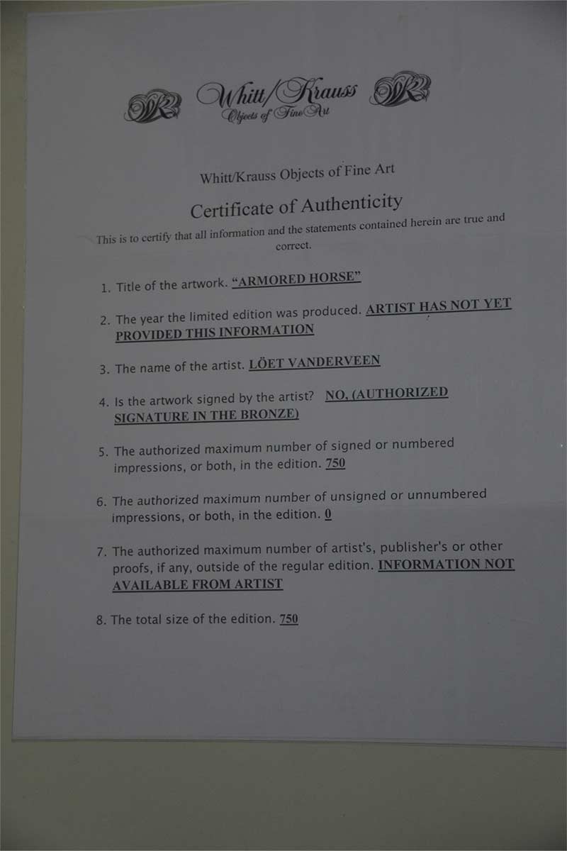 A rarely available bronze sculpture that is recognized and collected worldwide. This sculpture titled “Armored Horse” is yet another meaningful equine sculpture by the noted and collected worldwide sculptor-artist “Loet Vanderveen“. Available now on SculptureCollector.com, the premier platform for purchasing or reselling creative sculptures securely and privately.