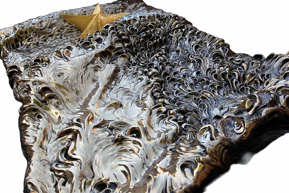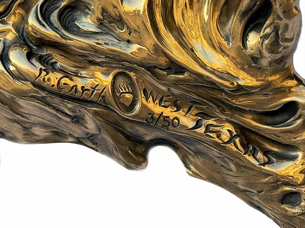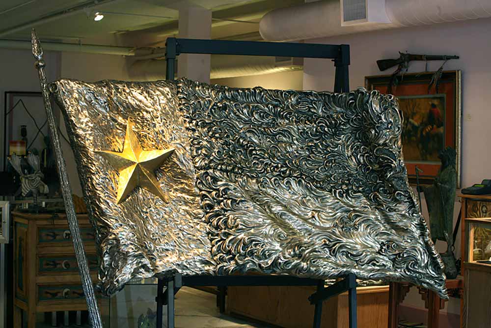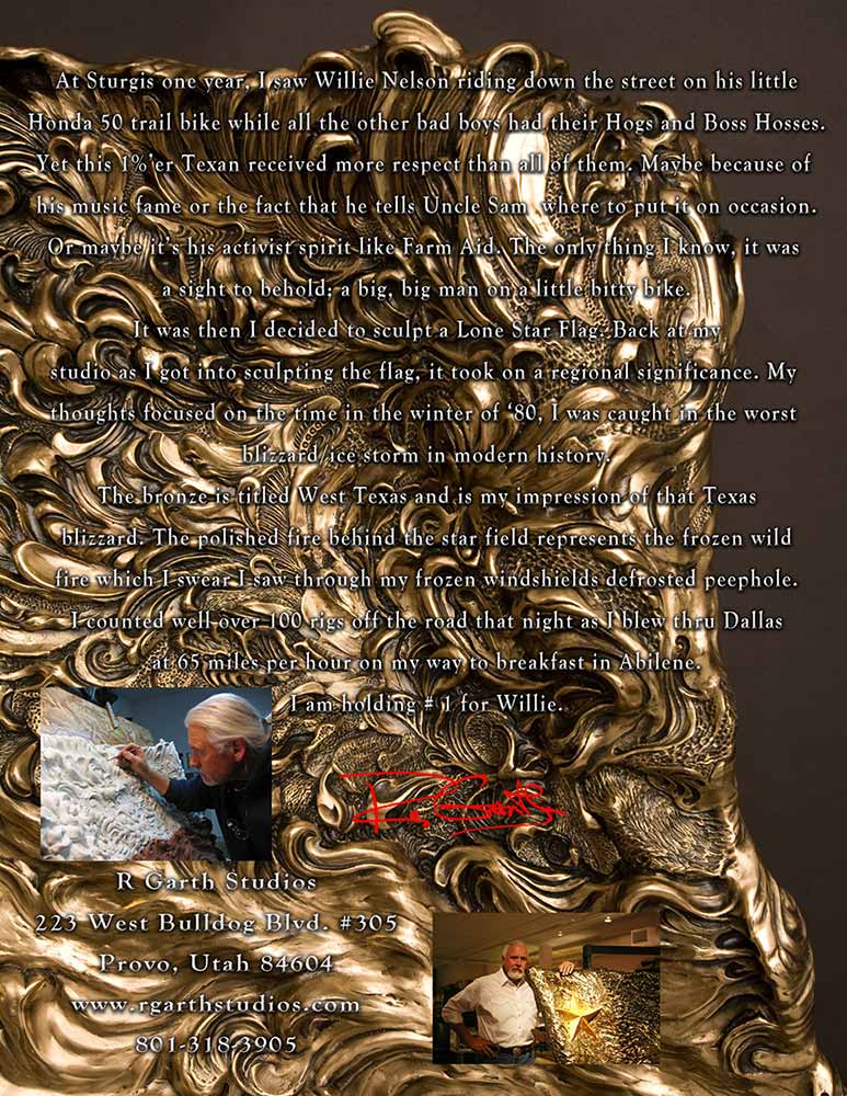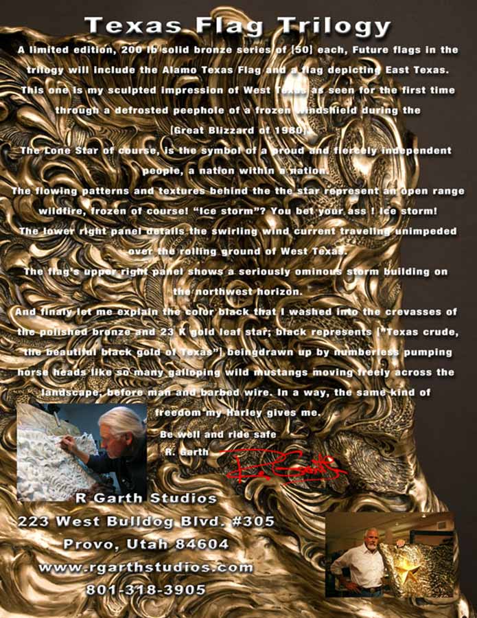 A limited edition, 200lb solid bronze series of (50)each. Future flags in the trilogy will include the Alamo Texas Flag and a flag depicting East Texas. This one is my sculpted impression of West Texas as seen for the first time through a defrosted peephole of a frozen windshield during the Great Blizzard of 1980.The Lone Star of course, is the symbol of a proud and fiercely independent people, a nation within a nation. The flowing patterns and textures behind the star represent an open range wildfire, frozen of course! “ice storm”? You bet your ass! Ice Storm! The lower right panel details the the swirling wind current traveling unimpeded over the ground of West Texas. The flags upper right panel shows a seriously ominous storm building on the Northwest horizon. And finally let me explain the color black I washed into the creases of the polished bronze and 23k gold leaf star. Black represents “Texas Crude, the beautiful black gold of Texas”, being drawn up by numberless pumping horse heads like so many galloping mustangs moving freely across the landscape before man and barbed wire. In a way, the same kind of freedom my Harley gives me.